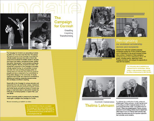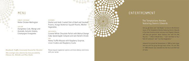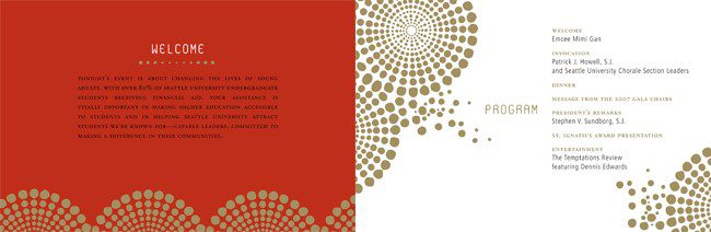 Gala Program for Seattle University. The gala materials had already been concpeted by their previous designer, so I got to flush out the design for the program, banners, and powerpoint. This was a nicely printed piece; the light grey areas indicate a spot varnish alone.
