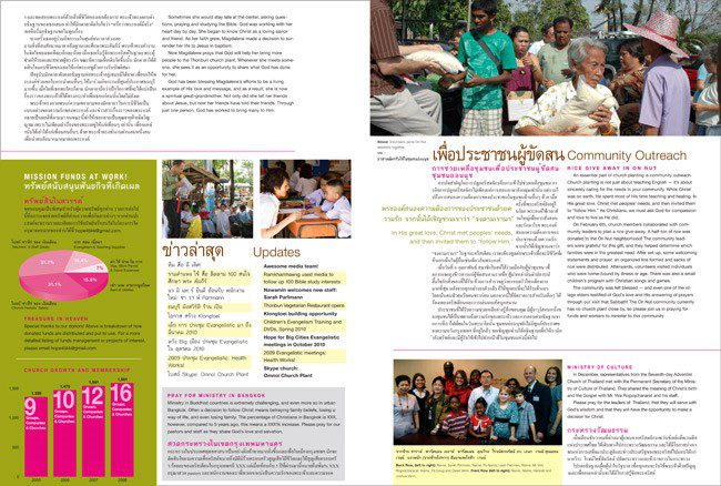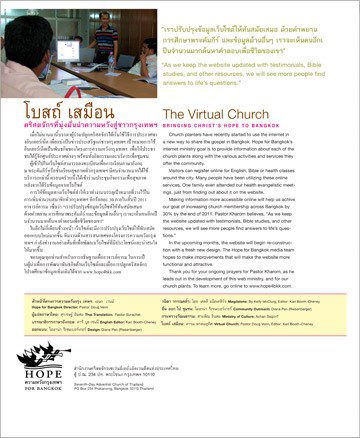 Hope for Bangkok is a ministry whose goal is to share the gospel in the metro Bangkok area through community outreach, church plants, vegetarian restaurant/cooking classes and affordable ESL classes. Working with a couple of other student volunteers, we helped support their ministry through various communication pieces and also made a start in developing their ministry's identity. Here's a bi-lingual newsletter I designed to update donors, church members and other interested audiences.