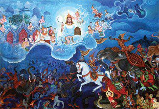 Postcards for Hope for Bangkok. The artwork is from large paintings by a Thai artist depicting different scenes of Christ's second coming, and other Bible stories. Painted in a traditional Thai style, the paintings also use an Asian method of story telling. For instance, if you look closely, you can see another small "cloud" showing Jesus born in Bethlehem.